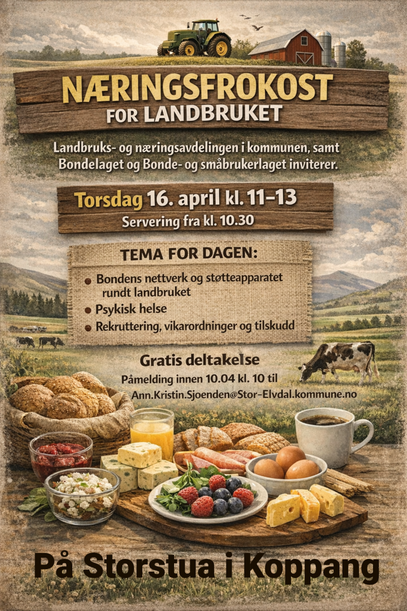 Landbruks- og næringsavdelingen i kommunen, samt Bondelaget og Bonde- og småbrukerlaget inviterer til næringsfrokost torsdag 16. april kl. 11-13. Servering fra kl. 10.30
